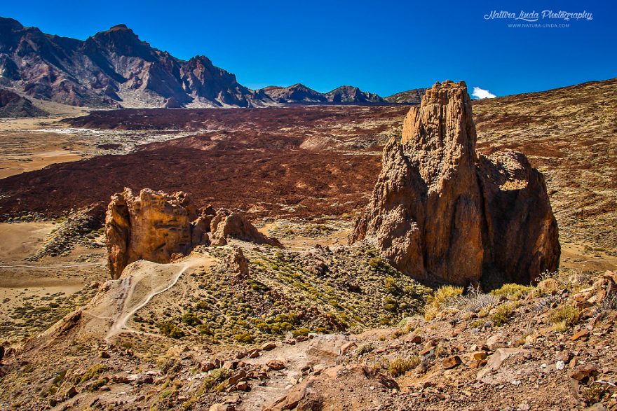 Skalní útvar Katedrála nad rozlehlou sopečnou kalderou Las Cañadas 74 km dlouhou.