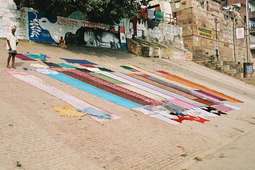 Kasta pradláků při své práci na břehu řeky Gangy.