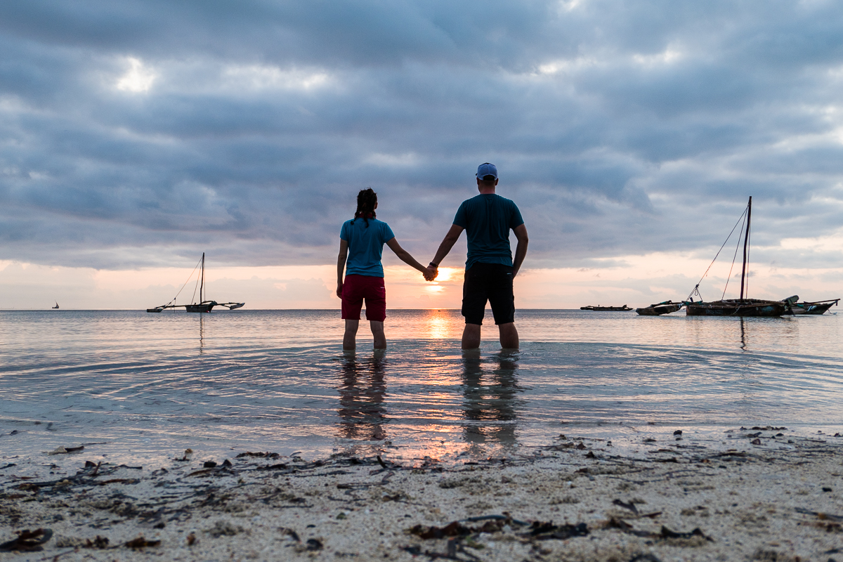 Západ slunce na pláži, Zanzibar