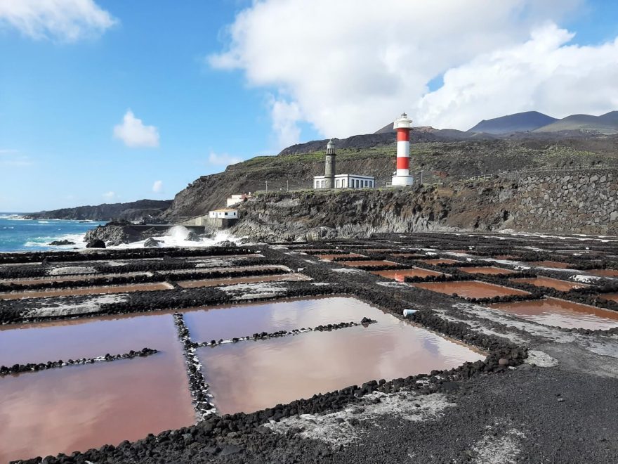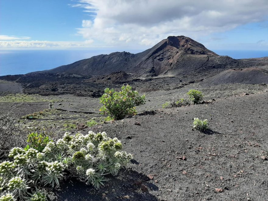 Sopka Tenequía a zřetelný proud zkamenělé lávy. Ruta de los Volcanes, La Palma, Kanárské ostrovy