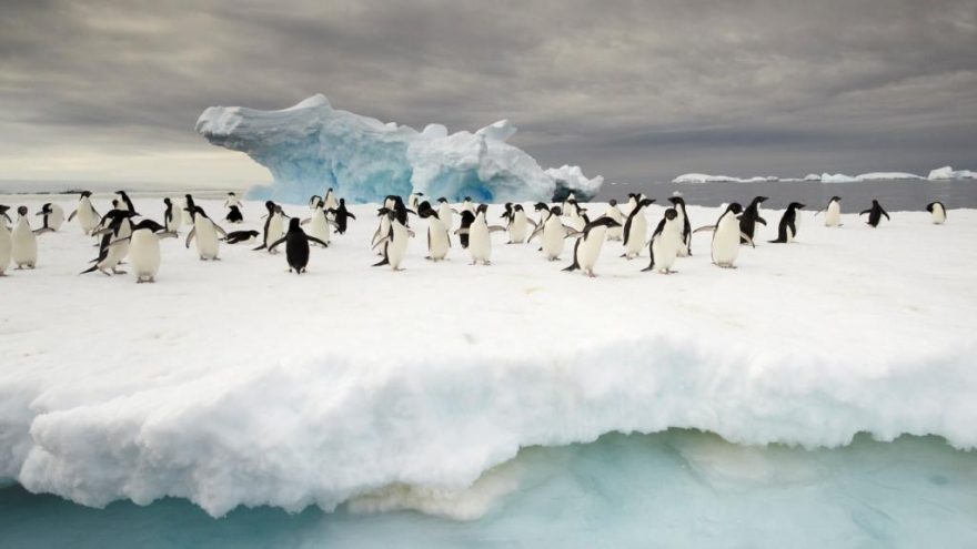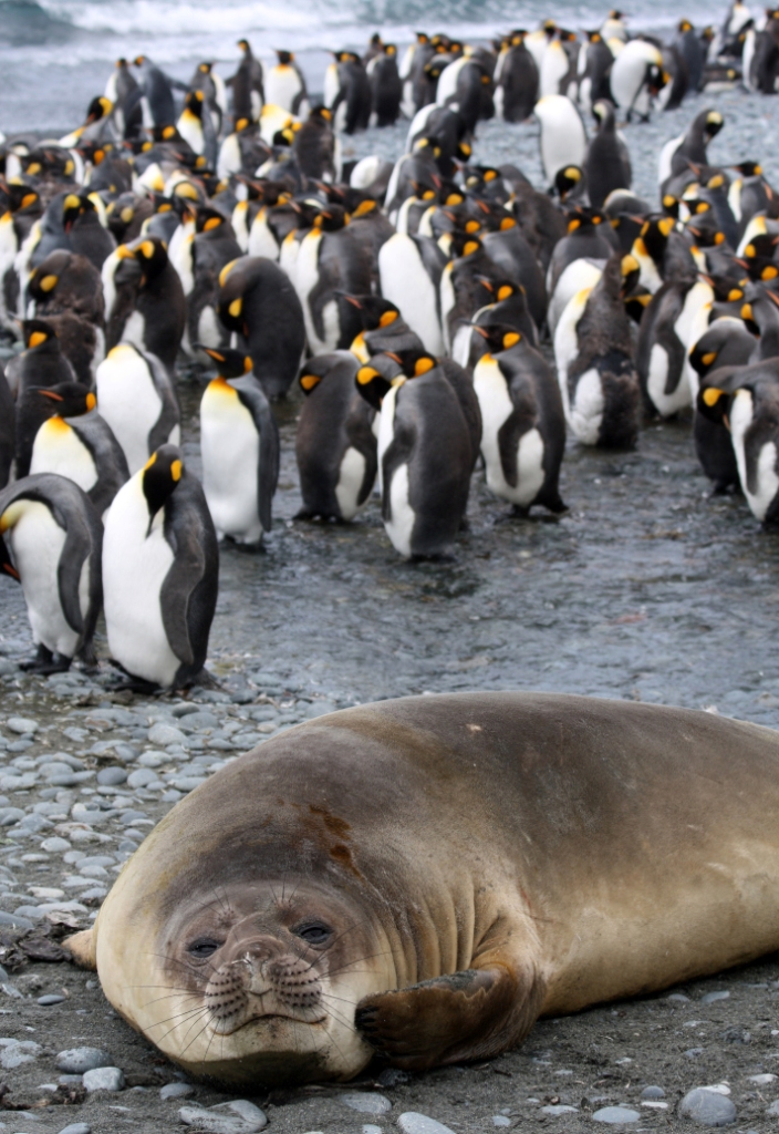 Tučňáci patagonští v popředí s rypoušem sloním (Southern Elephan Seal, Mirounga leonina). Zde se jedná o samici – samci jsou mnohem větší, váhou dosahují až 4.5 tuny a jsou obdařeni obrovským rypákem.