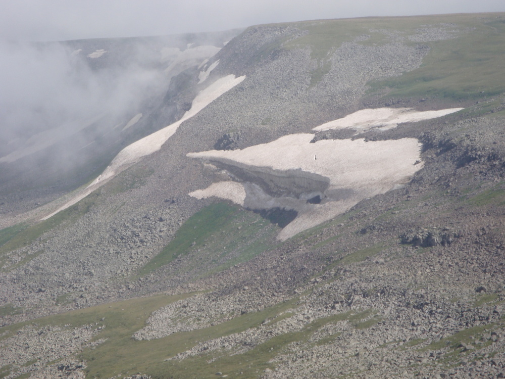 Sněhový převis, údolí v jihovýchodní části pohoří Geghama. Srpen, Arménie