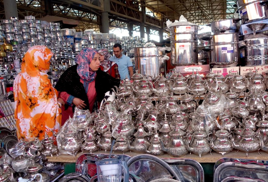 Prodej skleniček na čaj na tradičním tržišti souk, Maroko