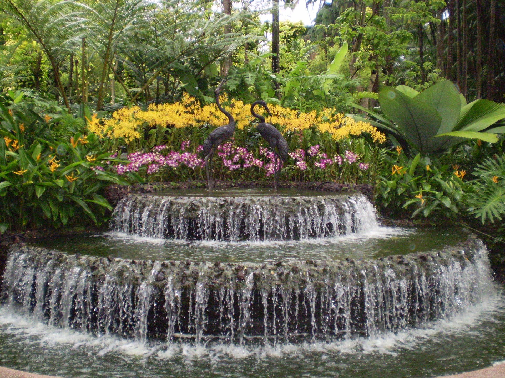 Jeřábí fontána vítá návštěvníky Národní orchidejové zahrady, nejznámější části areálu, Singapur