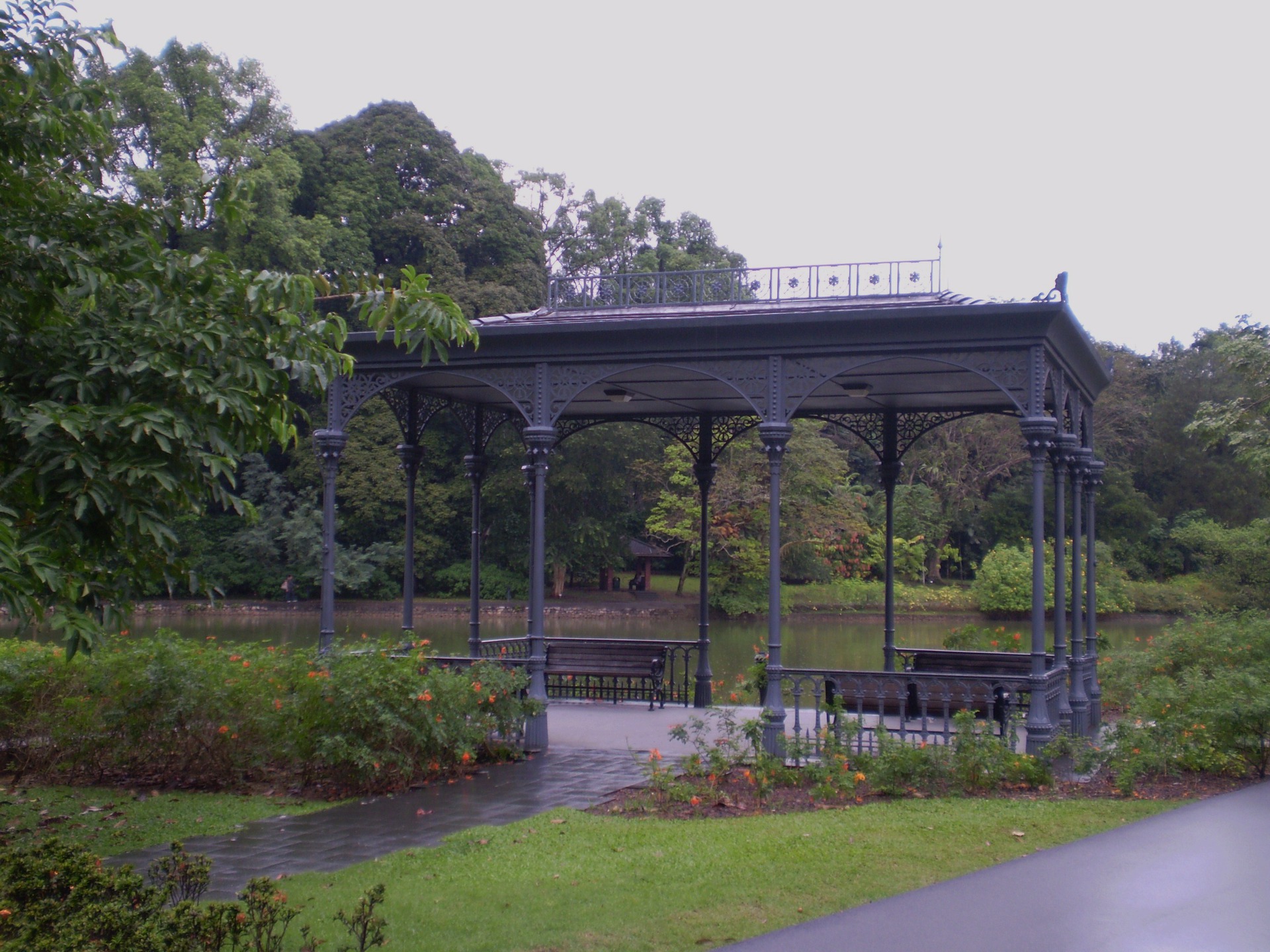 Odpočívat a vnímat poklid místa může člověk při posezení v řadě altánů, Singapur