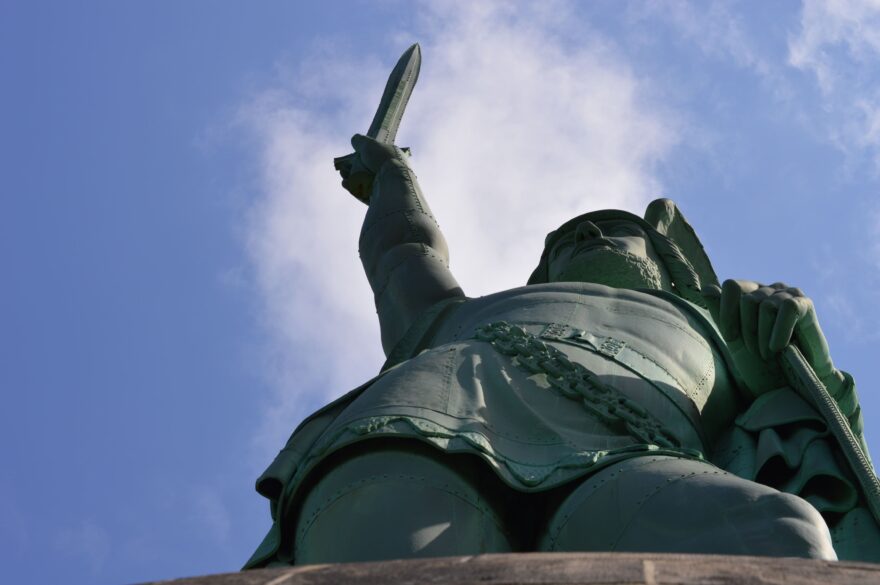 S vítězným gestem hledí náčelník Hermann do okolní krajiny