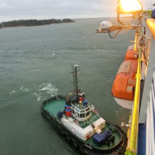Vlny naráží do trajektu a snaží se změnit jeho směr. Na pomoc přijíždí malý nenápadný remorkér, který hrdě čelí silnému nárazovému větru a vlnovému vzpírání Baltského moře. Těžký remorkér začíná diktovat směr mohutně vzhlížejícímu, leč bezbrannému trajektu s plným nákladem lidí i osobních a nákladních automobilů. Čím více se blížíme helsinskému přístavu, tím větší máme možnost seznámit se s racky, kteří nám nerušeně krouží nad hlavami. Vystupujeme. Čerstvý vzduch voní po moři. Vítr utichl. Nastává čas na prohlídku města.