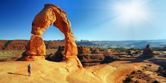 Protože jsme měli předchozí den v pondělí velký záběr z treku v oblasti Needles, rozhodli jsme se, že to nebudeme moc přehánět s chozením. Nešli jsme proto asi 5 km dlouhou stezkou k oblouku Delicate Arch, což je osamělý půlměsíc stojící na hraně pískovcové kotliny a který je známý z mnoha filmů, reklam a je ve státním znaku Utahu, ale prohlídli jsme si ho z Vyhlídky na Delicate Arch, nedaleko parkoviště.
