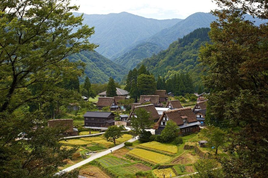 Japonský venkov a čerstvý horský vzduch zažijete v malebné vesničce Ainokura. Mezi rýžovými políčky na hustě zalesněných stráních se tu krčí asi 20 dřevěných domů pokrytých tlustými slaměnými střechami. Asi pět desítek místních obyvatel tu na podzim pilně sklízí rýži nebo se stará o hrstku turistů, která u nich ve vsi přespává. Večer se tak můžete stát divákem místního divadelního představení před chrámem a brzy ráno za svítání se projít probouzející se vesničkou.