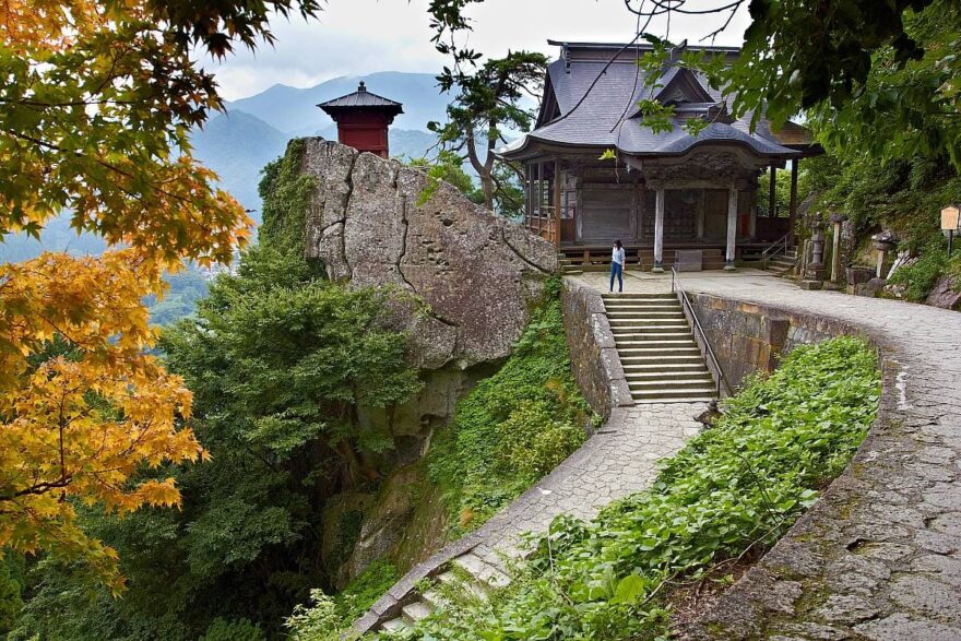 Severovýchodně od Yamagaty najdete Yamaderu – velký komplex buddhistických chrámů ukrytých vysoko na hustě zalesněných skalách nad údolím. Založili jej kolem roku 860 mniši, kteří sem z Kjóta přinesli posvátný oheň. Po tisíci schodech, které slouží k meditaci, vystoupáte až k dřevěnému chrámu Nokyo-do vystrčenému na skalce. Je to nejhezčí svatyně Yamadery.