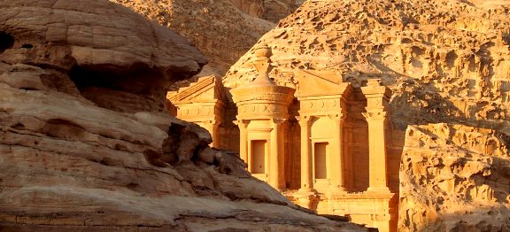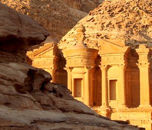 Nejznámější jordánská památka, samozřejmě zapsaná na seznamu UNESCO, leží asi tři hodiny jízdy jižně od hlavního města Ammánu, poblíž moderního a na turisty připraveného města Wadi Musa. Abychom se vyhnuli hlavnímu proudu turistů, jsme prvními ranními návštěvníky. Míjíme zajímavé bloky džinů a Hrob obelisků, do Petry vcházíme více než kilometr dlouhou soutěskouSík, která i v minulosti sloužila jako vstupní brána pro obchodníky s kořením, myrhou a kadidlem. Podél skal se zachovaly sotva znatelné reliéfy karavan a vodovodní kanálek, který přiváděl vodu do města v nitru skal a osvěžoval poutníky. Soutěska je v nejužším místě tak těsná, že se rozpaženýma rukama můžeme dotknout obou stěn. Mezi skalami se rýsují nádherné křivky sluncem zalitého pískovcového portálu Al-Chaznech, „Pokladnice“. Stejně jako všechny ostatní je i tato hrobka krásná zvenčí, ale velmi strohá a prázdná uvnitř.