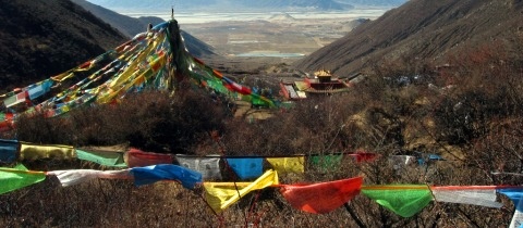 Začíná být horko, rychle také přibývá nadmořská výška. S každým krokem doufám, že už tam budeme. Naivně si myslím, že bychom mohli dorazit nejen k nejvýše položenému domku, ale až na vrchol hory. Celé údolí, které nás obklopuje ze tří stran, pokrývají tibetské barevné modlitební vlaječky, lungty. Na pravém svahu vidíme zamrznutou řeku a vodopády, šplháme okolo mnoha meditačních jeskyň, domků mnišek a tibetských stúp, čhortenů.
