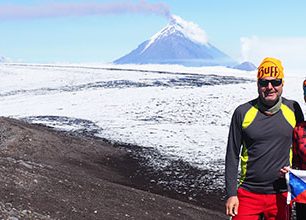 Tenhle významný vrchol nemůžeme nechat bez povšimnutí, a tak nás počasí neodradí a optimisticky se vydáváme na cestu. Máme přece GPS souřadnici vrcholu, tak to musíme zvládnout. Bloudění následuje po pár kilometrech, poradit nám nedokáže ani místní horský vůdce. Zhruba po hodině bloudění opouštíme chodník a vyrážíme přes lávové pole. Za ním už zase po znatelném chodníku stoupáme v mlze po lávě, později korytem říčky, po ledovci a v závěru sutí. Asi sto výškových metrů před kráterem jako zázrakem vystupujeme z mlhy. Pokračujeme podél kráteru a z dáli začíná z mraků vykukovat i Bolšaja Udina, Ovalnaja Zimina, Uškovskij, Bezymjanyj i samotná královna Ključevskaja, mohutně kouřící načervenalým dýmem. Při sestupu se mlha rozplyne úplně, a konečně vidíme i nádhernou sopečnou krajinu.