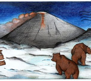 Sem tam narazíme na stopy medvědů. U kráteru jsme ale zklamaní. Je mlha a žádné čoudíky nevidíme. Jsme v rozpacích. Něco výstupu chybí. Asi půlhodiny mlčky sedíme u kráteru a tupě zíráme do mlhy. Když vtom to přijde. Mlha zmizí a kouřící Bezymjanyj nás vábí do svých pekelných útrob. Nevím, jak dlouho úplně fascinovaní sopečnou činností trávíme v kráteru. Hodinu, možná dvě, než se dosyta nabažíme čertovských čoudíků.