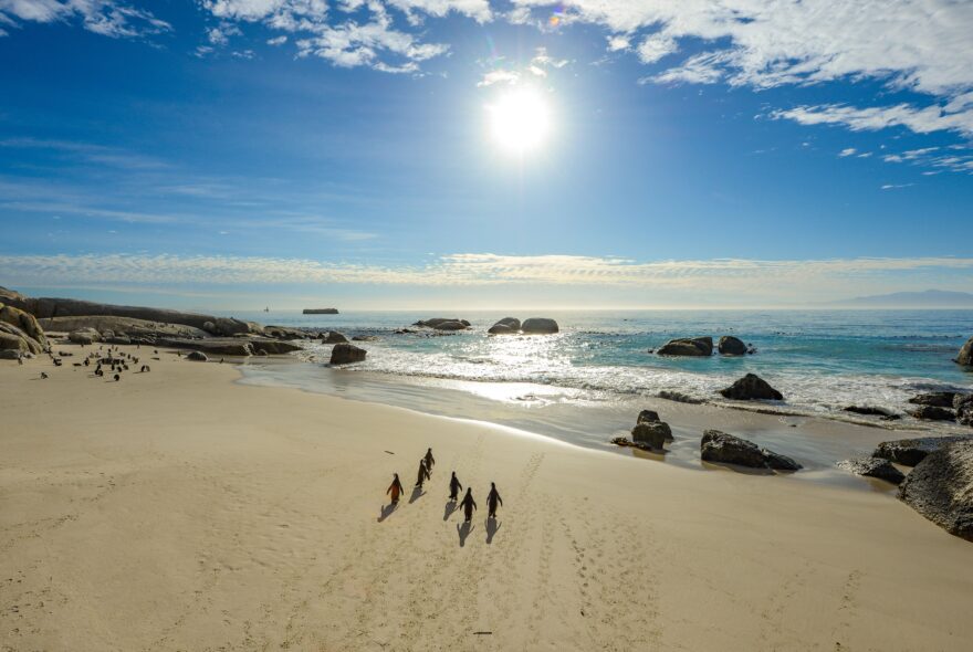 Pak se přehoupnete na východní pobřeží, do zátoky False Bay. Voda oceánu je tady klidnější a také o něco málo teplejší. Záhy vjedete do městečka Simon’s Town s malebnými dřevěnými domy. Tady rozhodně zastavte u pláže Boulders Beach a zajděte se podívat na kolonii tučňáků.