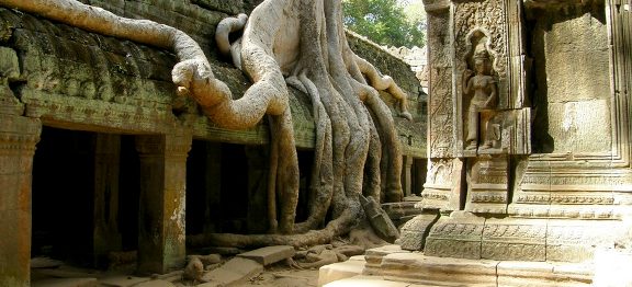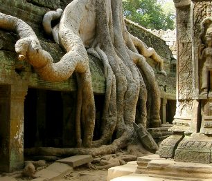 Podobně mystickou atmosférou dýchá impozantní rozsáhlý chrámový komplex Ta Prohm, který, ponechán v původním stavu, tak jak byl nalezen, je postupně zcela pohlcován džunglí. Stovky let starými ruinami prostupují mohutné kořeny stromů, které pevně obepínají kamenné bloky, jako by nad bludištěm chodeb a průchodů svými chapadly vládla obří chobotnice. Celkovou atmosféru ztraceného světa potom dokreslují všudypřítomné hlasy džungle. Mezi oběma chrámy, u zarostlé východní hradby Angkor Thomu najdete ještě další menší chrámy ukryté ve stínu vysokých stromů – například kompaktní Thommanon, maličký TaNei nebo chrámovou horu Ta Keo.