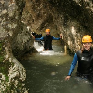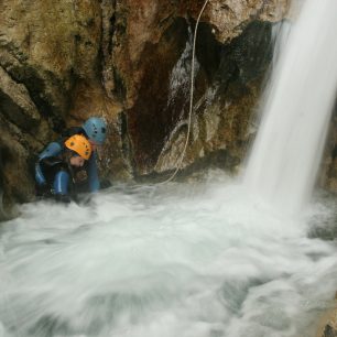 Jakmile smočím nohy v křišťálově čisté vodě, je jasné, proč na canyoning nestačí obyčejný vodácký neopren. Voda je ledová a dalších několik hodin se v ní budeme ráchat skoro nepřetržitě. Po několika metrech chůze potokem je před námi první překážka. Hluk, který vytváří padající voda malého vodopádu, je umocněn stěnami kaňonu a chvílemi mám co dělat, abych rozumněl průvodci Matějovi, který vysvětluje, co a jak. Poučeni o správné technice skoku se jeden po druhém vrháme do tůně a plaveme po proudu do míst, kde už Katja čeká u další překážky.