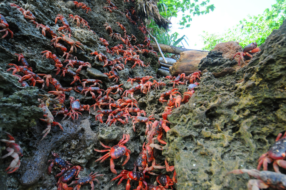 Více než 45 milionů těchto zářivě červených suchozemských krabů žije ve vlhkých lesích Vánočního ostrova. Po většinu roku přebývají na jednom místě, ukrytí ve své díře. Živí se převážně spadaným listím, ovocem a rostlinami. Nejraději mají čerstvé zelené listy. Nejsou ale výhradní vegetariáni, zkonzumují klidně i další mrtvé kraby a ptáky, plže a lidský odpad, pokud se jim naskytne příležitost.