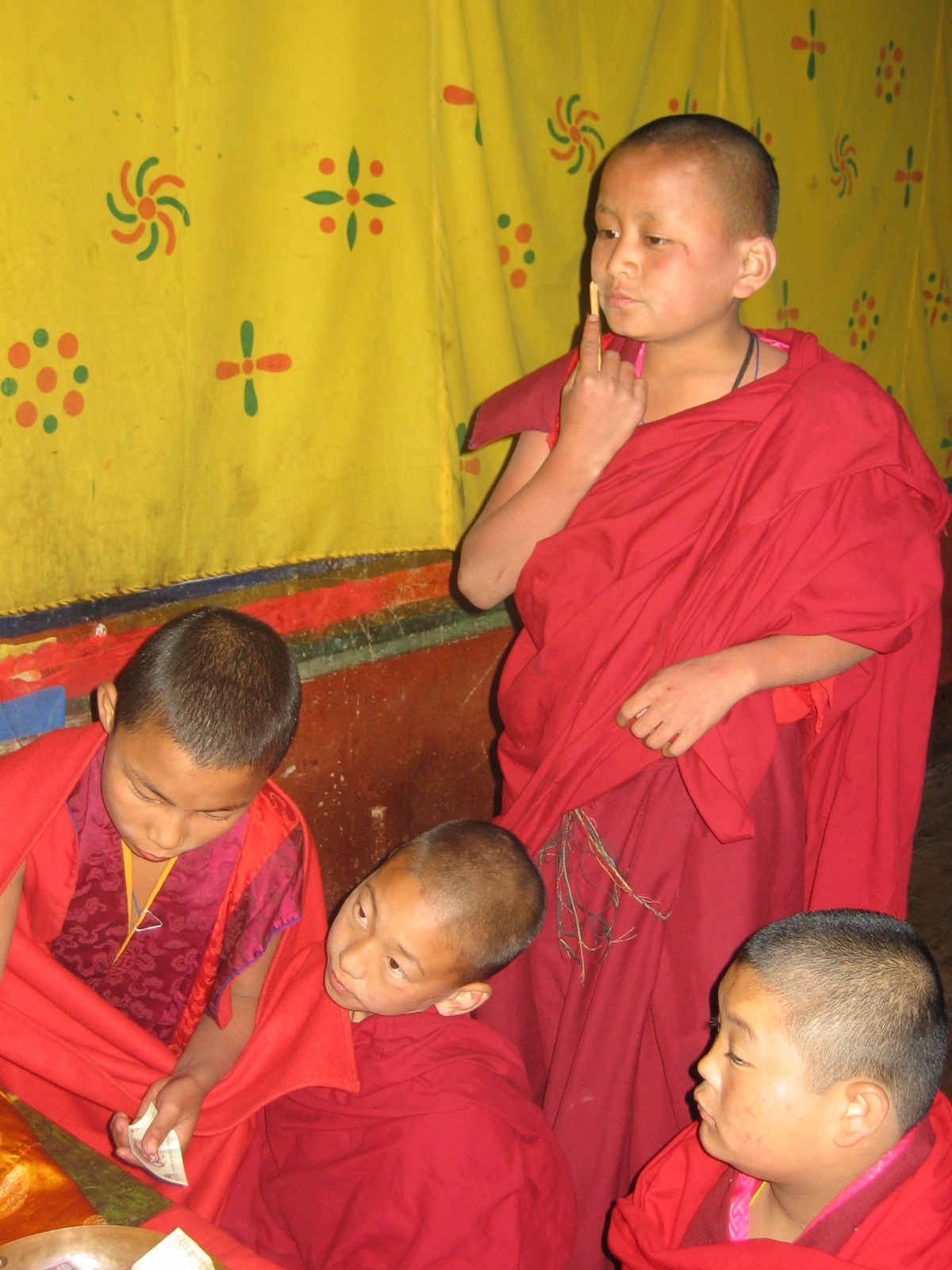 Vznešené vystupování jim ale vydrží jen na hlavní nádvoří, kde se začnou pošťuchovat, honit a hrát fotbal s jednou z rozpadajících se bot. Pokřikování mnichů se rozléhá mezi zdmi dzongu, které jsou nádherně vyzdobené dřevem se spoustou vyřezávaných ornamentů ve zlaté, červené, modré a žluté barvě a mandalami života. Do města se vracíme klášterními zahradami, přes tradiční dřevěný most Nyamai Zam omotaný modlitebními praporky.