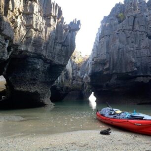 Veškeré vybavení musím mít na dosah, po ruce kamínky a klacek, bez praku to je přeci jenom horší. Zabalit a postupně vše odnosit směrem k moři, po krátkých úsecích tak, abych měl všechno pořád na dohled a v případě opičího útoku mohl rychle doběhnout. Jeden, druhý, třetí úsek a jsem konečně na písku, ukládám věci do kajaku, tentokrát se opicím nic zničit ani ukrást nepodařilo, ale stálo mě to dost úsilí.