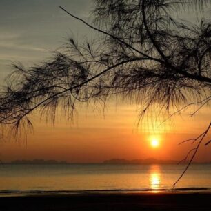 Brzo ráno se probouzím s pohledem na hladké moře, slunce leží zatím velmi nízko a řada stromů lemujících břeh vrhá stín několik desítek metrů daleko na mořskou hladinu.