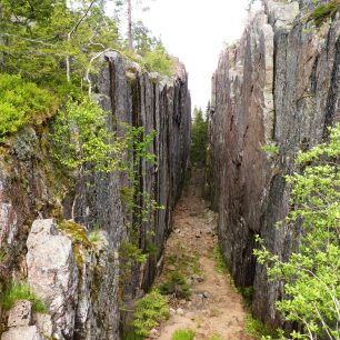 Ještě kousek a už se kocháme výhledy z plochého vrcholu NP Skuleskogen na moře i na západní část parku dále od pobřeží s lesy a skalami, kterou bohužel nemáme čas prozkoumat. Máme štěstí, že se na vrcholu zdržujeme na oběd ve formě knäckenbrödu se sýrem, protože se protrhávají mraky, které od rána halí nebe, a slunce rázem ohřívá chladný severský vzduch. Z vrcholu Slåttdalsberget je to co by kamenem dohodil z kopce do jedné z místních největších přírodních atrakcí, kaňonu, resp. soutěsky Slåttdalsskrevan. Je to asi 200 metrů dlouhá, 30 metrů hluboká a 7 metrů široká jizva v krajině, která má ohromné kouzlo a říká si tím o důkladné prozkoumání a focení.