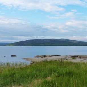 Od severního vstupu se vydáváme po dobře značené cestě směrem na jih, dýcháme svěží mořský vzduch. Na rozcestí se dáváme doleva a pokračujeme podél pobřeží. Druhá stezka míří nahoru na kopec Slåttdalsberget (280 metrů), kam se chystáme až zítra v rámci naplánovaného okruhu. Cestička vede částečně lesem, zčásti také po písčité pláži, terén je to nenáročný, alespoň se můžeme kochat krajinou bez lidí, nad kterou krouží velké množství ptáků. Naše asi hodinové putování končí na poloostrově Tärnättholmarna vzdáleném asi 3,5 km od severního vstupu do parku. Následuje průzkum místních chat, které slouží jako noclehárny pro turisty, jejich využití je zdarma a nejlepší zprávou je, že v NP Skuleskogen se jich nachází hned několik.
