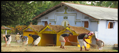 Skromné místnosti mnichů jsou situovány okolo svatyně a tvoří čtvercové náměstíčko. Na velkých kulatých podnosech se tu suší obilí. Zatímco my putujeme po sátrách, abychom si je prohlédli a nasáli atmosféru, indičtíturisté putují také, ale oni to berou jako pouť po posvátných místech, kde dávají obětiny a dostávají požehnání.
