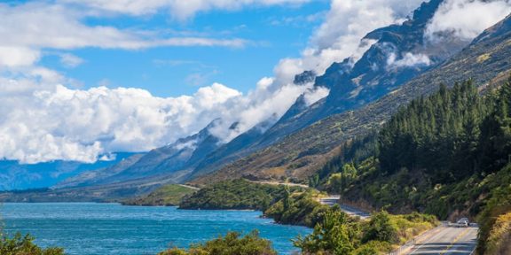 I když se ráno zamračilo a foukal silný vítr, cesta přes průsmyk Hasst Pass byla nádherná. Tam, kde se dotýkaly úpatí mohutných zalesněných hor, zurčela mezi balvany čirá říčka Haast. Krajinný ráz se měnil od deštných lesů, přes pobřežní les, až po travnaté kopce. Průsmyk používali kdysi Maoři jako nejkratší cestu mezi horami. Nejdříve jsme se vydali k vodopádu Roaring Billy přes bujný porost stromů obrostlých měchem. Ze zelené hory nad třpytivě modrou řekou několika místy kaskádovitě padala voda. Poté jsme zastavili na Pleasant Flat kvůli nádhernému obrazu zelených lesů v údolí a s pozadím zasněžených vrcholů hor. U největšího vodopádu Fantail byla autobusová výprava Izraelců, hromadně s nimi jsme fotili proudy vody stékající do azurové říčky. Na terase restaurace v Makaroa jsme si dali fajnové kapučíno a pozorovali krajinu. Nakonec se cesta svažovala k jezerům Wanaka a Hawea. Na stráních hrajících všemi barvami začínajícího podzimu se pásly ovce. Je až neuvěřitelné, jak maličké osady s pár domy označují kiwáci za města, a tak je nazývají i na mapě. Například tato kavárna byla jediná během celé cesty.
