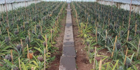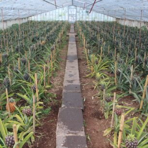 Ananasová plantáž s typickými malými, ale sladkými plody