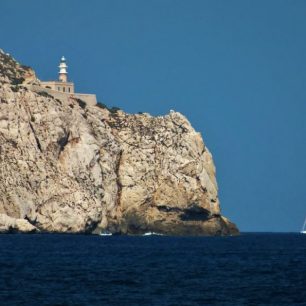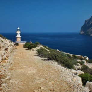 Vydala jsem se tedy kamenitou cestou vedoucí kolem olivovníkového háje nejprve k vyhlídce Na Miranda. V piniovém háji kousek od vyhlídky je umístěno několik dřevených stolů s lavičkami určenými pro piknik. Z vyhlídky cesta pokračuje na rozcestí Collet de Tramuntana, kde se okruh č.1 stáčí doleva zpět do zátoky a kde se zároveň napojuje na druhou trasu mířící ze zátoky k majáku. Vydala jsem se tedy do prava po stezce č.2. Ta nejprve vedla lesem, později se stromy rozestoupily a přede mnou se rozprostřelo panorama severního cípu ostrova a vysoké útesy protější Mallorky.