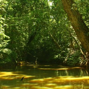 Opět odrážíme a po deseti minutách parkujeme na místě, které by žádný dobrodruh neměl minout. Velký Canopy Walkway. Jedná se o soustavu lanových lávek, natažených v korunách pralesních obrů. V nejvyšších místech procházíme 40 metrů nad zemí, ve světlejších partiích pralesa, do kterých mají přístup jen ptáci a opice. Procházka je dlouhá asi půl kilometru a není příliš vhodná pro zvracivce. Pohled do korun menších stromů a palem shora je k nezaplacení, země je skrz hustou vegetaci vidět skutečně málokdy. Po návratu na zem scházíme hustým porostem na břeh, kde usedáme do lodi. Čeká nás dvouhodinová plavba proti proudu řeky. Cestou míjíme několik osad původních obyvatel, kteří kráčí s dobou a své „původní“ chýše modernizují satelitními parabolami. Při pohledu z lodi do zelených stěn si nedovedu představit, jak se probíjíme 20 km něčím takovým.