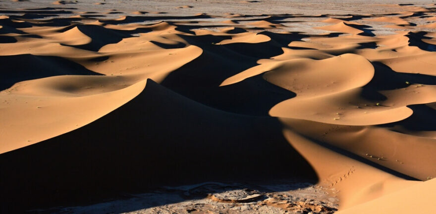 Dokud nezačneme lézt nahoru, má duna i krásně vyfoukané hrany, jako když střelí. Než se do výstupu pustíme, stojí za to se na pár okamžiků zastavit a rozhlédnout. Je pozdní odpoledne, blíží se západ slunce. Od obzoru k obzoru není vidět nic jiného než písečné duny a porosty tamaryšku. Po přesypech začínají s klesajícím sluncem tančit stíny, keříky se lehce chvějí v mírném větříku. A to ticho! Tady na okamžik opravdu podlehnete dojmu, že jste na světě docela sami.