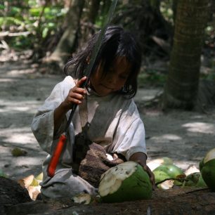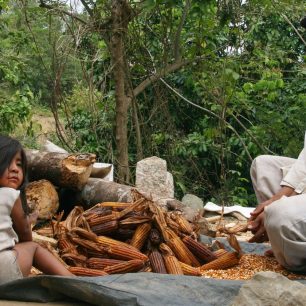 Po několika zdvořilostních frázích (umí relativně dobře španělsky), nás zve k sobě domů, resp. na dvorek mezi dva malinkaté dřevěné kruhové domky se střechou z palmových listů. Na dvorku sedí jeho syn a dvě vnučky a loupou kukuřici. Vedle nich líně leží ušmudlaný pes a několik slepic. Snažím se navázat nějaký hovor, ale jde to těžko, všichni se nesměle usmívají a spíše si hledí své práce. S dovolením dělám několik fotografií a pokračujeme v cestě. Džungle se pomalu mění, respektive řídne, úzká cestička se rozšiřuje na cestu, na které jsou již stopy po motocyklech a ještě níže i aut. Přicházíme do Calabaza, městečka na hlavní spojnici Santa Marta – Riohacha – hranice s Venezuelou.