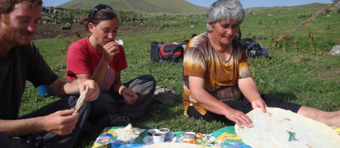 Po třech nocích v našem dalším arménském domově nedaleko vesničky Tsovazard jsme brzy ráno sbalili bágly a vydali se nahoru na hřeben sopečného pohoří Geghama, jehož kuželovité krátery byly jasnými orientačními body. Z počátku jsme procházeli sečnými loučkami s cestami, táhnoucími se nad vesnici. Později se cesta ztrácela v nesečených loukách, kde bylo dusno a hmyz. Vodou jsme šetřili, ale moc to nešlo. Ještě jsme nějakou dostali u pastevce Tigrana, který převracel s koněm trávu. S Tigranem dodnes komunikujeme, měl vysokou školu ekonomie v Jerevanu a uměl anglicky. Dál už voda nebyla ještě celý den.
