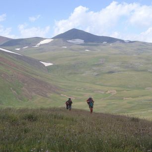 Večer jsme pod hřebenem rozdělali stan, ve výšce cca 3000 m n. m. ( jezero Sevan má 1900 m.n.m.). Zamířili jsme bez batohů ve dvou pod sněžný flíček, jestli nenajdeme potůček. Potůček by tam býval byl, ale pečlivě si ho hlídali tři vlci, kteří se vůbec nebáli. Proto jsme vzali nohy na ramena a zkusili pasteveckou osadu nedaleko. Kafe, meloun a voda a zas dobří lidé. Ráno už se šlo dobře, mírně zvlněnou náhorní plošinou/hřebenem mezi sopečnými kužely.