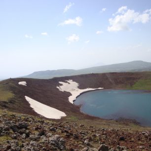 Ze sedla pokrytého sněhovým políčkem, na které jsme dorazili, je nádherný výhled na Azhdahak, mohutný sopečný kužel, hrající nejrůznějšími barvami hornin, od červené, přes zelenou až do černé. K hoře jsme scházeli sedlem, ve kterém jsou obrovské bloky vyvržené lávy, jakoby ožehlé na straně vystavené vulkánu. Dojem z okolí tohoto vrcholu je majestátný.