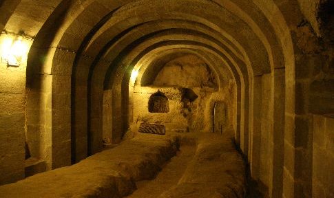Derinkuyu: Největší podzemní město najdete v Derinkuyu. Také ono leží nedaleko od Nevsehiru, asi 30 kilometrů jižně. Pochází zřejmě z období kolem roku 700 n. l. a bylo postaveno kolem 85 metrů hluboké šachty. Z té vybíhá dalších 52 větracích komínů, které přivádějí vzduch do celého rozlehlého komplexu. Jako úkryt před nepřáteli bylo využíváno od dob římské říše, celkem třikrát se ubránilo útokům zvenčí. Město mělo vlastní zásobárnu vody, cisternu s objemem asi 30 tisíc litrů. V dolních patrech jsou umístěná skladiště a také kaple.