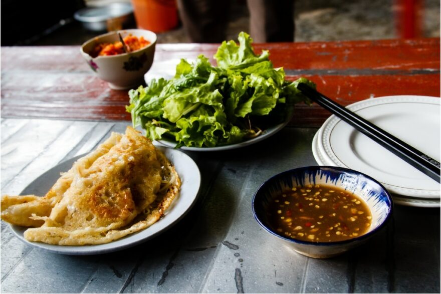 Bánh Xèo můžete jíst samostatně s bylinkami, omáčkou a salátem nebo si placku nakrájet na menší kousky a udělat si s rýžovým papírem a bylinkami čerstvý závitek.