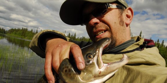 Okolní příroda je překrásná, zakrslé severské smrky, kvetoucí žluté upolíny i temná čistá voda tvoří nádhernou kulisu. Ani ne po kilometru se objevují první malé peřejky neboli „šivery“. Na březích jsou čas od času malá tábořiště. Díky relativní dostupnosti je říčka oblíbená i mezi místními vodáky. Ti však na „splav rječky“ vyrážejí obvykle až v letních měsících a my se tu plavíme už v první polovině června. Zkoušíme rybářské štěstí a už k první večeři máme překrásnou štiku a několik lipanů. To nejlepší nás ale teprve čeká. Řeky Kolského poloostrova jsou proslavené množstvím atlantických lososů, kteří táhnou proti jejich proudu od jara až do podzimu naklást jikry.