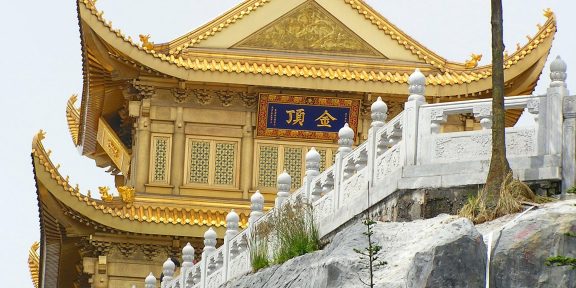 Emei Shan patří mezi čtyři hlavní posvátné buddhistické hory v Číně. První chrám tu byl postaven už v době počátků buddhismu v této zemi, ve 14. století zde stála stovka klášterů. Po skončení kulturní revoluce začal komplex sloužit spíše jako kulturní památka, ale snad se sem pomalu vrátí i náboženský život. Čínský buddhismus je mahajánový. Znamená to, že uctívá Buddhu jako boha a modlí se v jeho pomoc i podporu při hledání cesty k nirváně. Stejnému účelu slouží i množství bódhisattvů, Maitréja jako obtloustlý Buddha budoucnosti i poněkud křesťansky pojatý Amitábha. Mahajána tedy včlenila ještě větší mnohobožství a pověrečnost, než které sám Buddha v hinduismu odmítal.