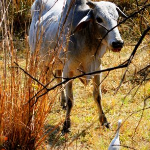 Za chvíli už jsme na cestě úplně sami, tedy kromě antilop a všudypřítomných krav. Čápy a marabu pozorujeme ze dvou metrů. Za dvacet minut ale dorazíme k ceduli s oním varováním před tygrem. Nemáme dostatek odvahy, a tak obracíme a pomalu se vracíme zpět na hlavní stezku. Přesto se jednomu nepříjemnému setkání nevyhneme.