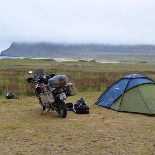Těsně před příjezdem je veřejné tábořiště, krásná zelená loučka pod svahem. Jsem tu sám, i když večer se tu objeví ještě dva stany. Na Islandu se nekrade a ani neničí, což dokazuje i dřevěná budka se sociálním zařízením, kde je dokonce i toaletní papír a z druhé strany nerezová páková baterie s tekoucí vodou. Neodpustím si myšlenku, jak dlouho by takové veřejné tábořiště zůstalo nepoškozeno u nás. I když jsem na zimu poměrně dobře vybaven, tuto noc na sebe navlékám vše, co mám, a nic bych za to nedal, že se v noci rtuť teploměru koukla i kousek pod nulu.