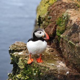 Prošel jsem se asi tři kilometry podél útesů a mlha se už opravdu zvedla, tak znova fotím tu nádheru syrové, lidským konáním nepoznamenané přírody. Když jsem se vrátil na kraj útesu, kde jsem měl možnost si tak zblízka nafotit papuchalky, neodolám a zaléhám do trávy na kraji útesu a fotím nedaleko sedícího papuchalka. Zkouším na něj hvízdat, volat i prosit jej, aby trochu změnil polohu a zapózoval mi, ale on mě sice zvědavě pozoruje, ale jinak na mě docela jasně kašle.