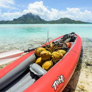 Typická silueta ostrova Bora Bora se objevuje před přídí jachty, která uhání vodami Pacifiku k naší další zastávce, vzdálené od Maupiti necelé čtyři hodiny plavby. Laguna je široká, rozlehlá a lemovaná desítkami palmových ostrůvků motu. Uprostřed hlavního ostrova se tyčí monumentální skalnatý masiv přes 700 metrů vysoké a nepřístupné Mt. Otemanu. Na průzkum ostrova a laguny máme celé čtyři dny, během kterých objevujeme nádherná zákoutí tohoto ráje na Zemi. Oproti Maupiti je Bora Bora větší, pořád ale můžeme jeho centrální ostrov objet na kole za půl dne – okružní silnička měří jen něco málo přes 30 kilometrů.