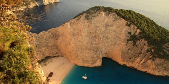 Slunce už se sklání a zlatí skály padající do moře, když přijíždíme k vyhlídce na zátoku a pláž Navagio. Výhled z 200 metrů vysokého skalního ostrohu je ohromující. Zátoky vyhlodané vlnami a erozí se zařezávají hluboko do pevniny, z níž vybíhá tenký ostroh do moře. Snad aby byla pláž v zátoce ještě atraktivnější, ztroskotala na ní počátkem 80. let pašerácká loď.