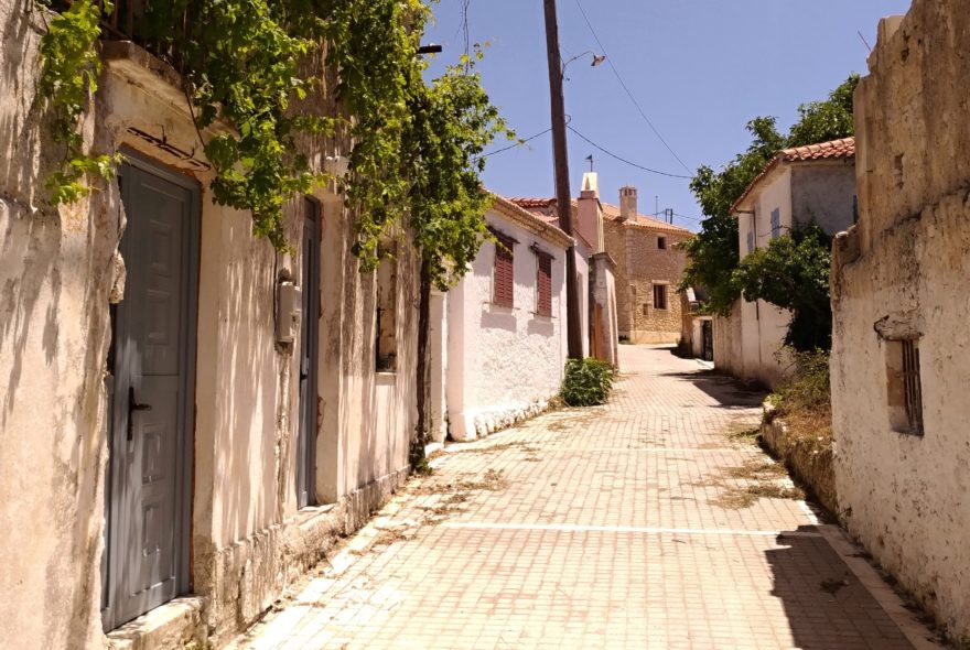 Exo Chora – jedna z fungujících vesniček centrální vrchoviny a nejstarším olivovníkem na ostrově. Můžete si tu koupit bylinkami aromatizovaný olivový olej nebo růžový likér.