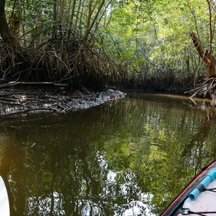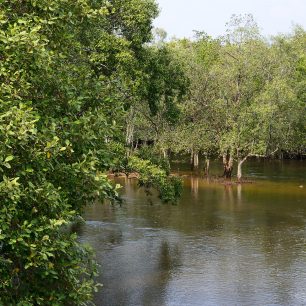 Proplouvám bočními kanály, které se stáčejí mezi propletenými opěrnými kořeny mangrove, postupně se zužují, po obou stranách pevně sevřené spletí kořenů, nad kterými vyrůstá hradba stromů, jejichž koruny tuto vodní cestu vysoko nad hladinou uzavírají, jako by chtěly jejich svět ukrýt.