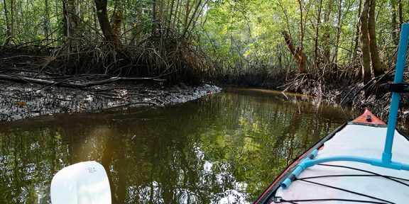 Srovnání s Amazonií je stejně jako podobné příměry trochu nesmyslné, ale na druhou po několika hodinách pádlování hustě zalesněnou krajinou částečně ponořenou do stoupající a klesající mořské hladiny můžu říct, že několik podobností se tu určitě najít dá. Není tu samozřejmě taková druhová rozmanitost, a to flory ani fauny, ale života je všude kolem opravdu hodně, pod hladinou poloslané vody i v blátě a na příležitostné souši mezi porostem mangrovů s jejich hustými, vzájemně propletenými kořeny.