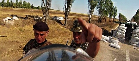 Smykem vedle mě zastaví velké bílé nákladní auto. Leknu se. Z kabiny vyskáče asi pět lidí v maskáčovým nebo khaki oblečení. Maník s kalašnikovem v ruce a s „americkejma“ brejlema, co je mají ti drsňáci, povídá: „Doklady!“ Chytl jsem se jako za srdce a ukázal jim emoci, jako že jsem se lekl. „Uf, já se lekl, v tom civilním autě vypadáte jako teroristi a ne jako ukrajinská armáda!“